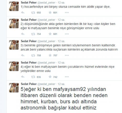 "Eğer ki ben mafyaysam 92 yılından itibaren düzenli olarak benden neden himmet, kurban, burs adı altında astronomik bağışlar kabul ettiniz" diyen Peker'in açıklamaları şöyle.