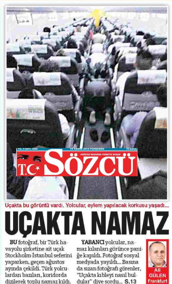 Özel bir Türk havayolu şirketinin Stockholm-İstanbul seferini yapan uçakta namaz kılınması Sözcü gazetesinde ilginç bir şekilde haber oldu.